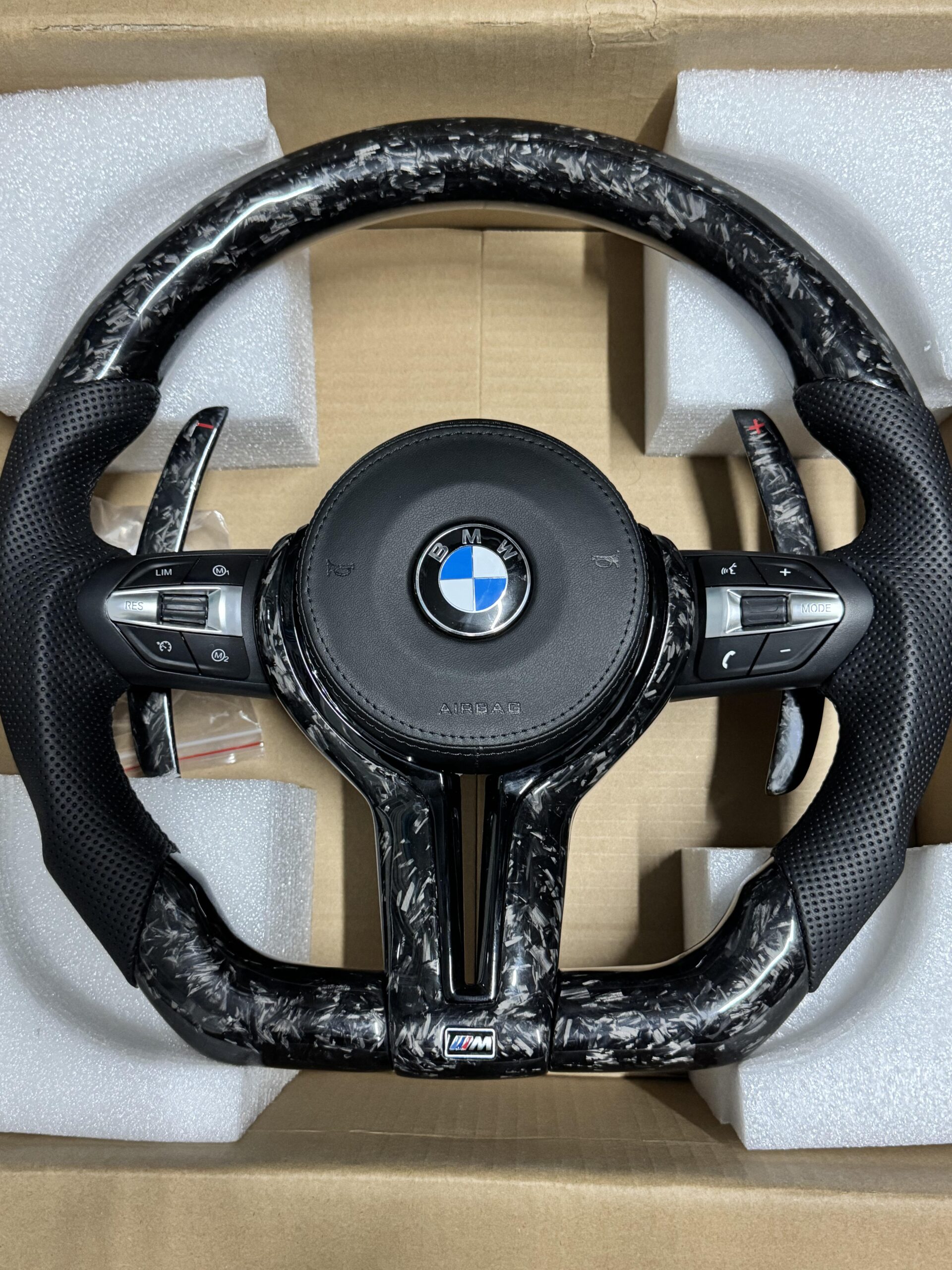 Enhance your BMW 3 Series interior with this black forged carbon steering wheel, crafted for precision, performance, and luxury. Featuring a bold forged carbon finish and ergonomic design, it offers superior grip, comfort, and control—perfect for drivers who demand both style and driving excellence.